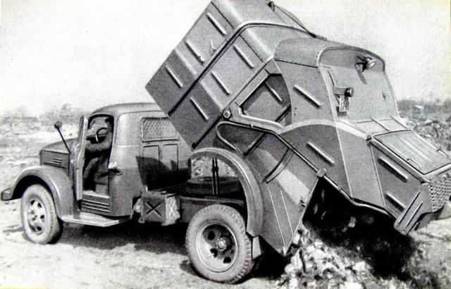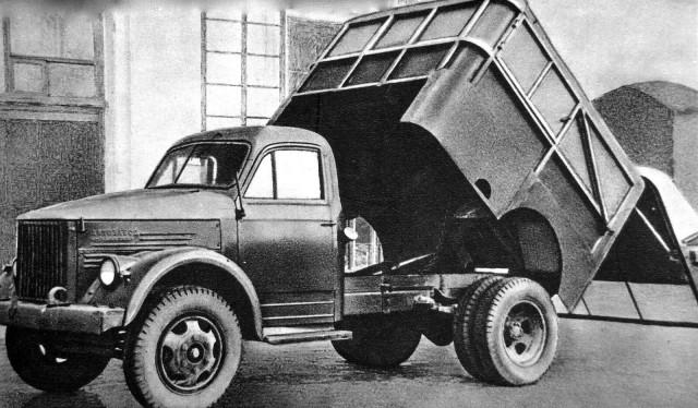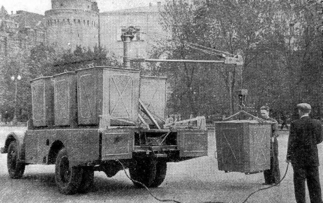 Первые советские мусоровозы МС-1 на грузовике ЗИС-5 с подъёмным ковшом и гидроприводами от самосвала. 1947 год