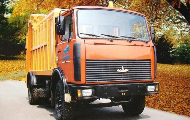 Белорусский 180-сильный мусоровоз МАЗ-5809 для сбора и транспортировки промышленных отходов с 10-кубовым кузовом и толкающей плитой с троекратным уплотнением. 1989 год