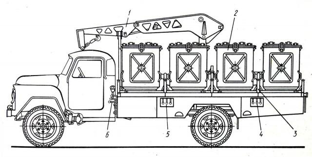 Схема мусоровоза М-30А: 1 – гидрокран, 2 – контейнер, 3 – опрокидывающаяся платформа, 4, 5, 6 – пульты управления