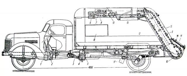 Схема мусоровоза МС-2. Основные агрегаты: 1 – коробка передач, 6 – гидронасос, 9 – транспортёр, 10 – приёмный бункер, 15 – гидроцилиндр подъёма задней стенки, 17 – гидроцилиндр подъёма кузова, 18 – боковая дверь