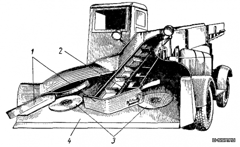 Схема снегопогрузчика 2С-3. Основные агрегаты: 1 – загребающая «лапа» с ограждением, 2 – цепной транспортёр, 3 – диски для привода лопаток, 4 – основная сварная лопата
