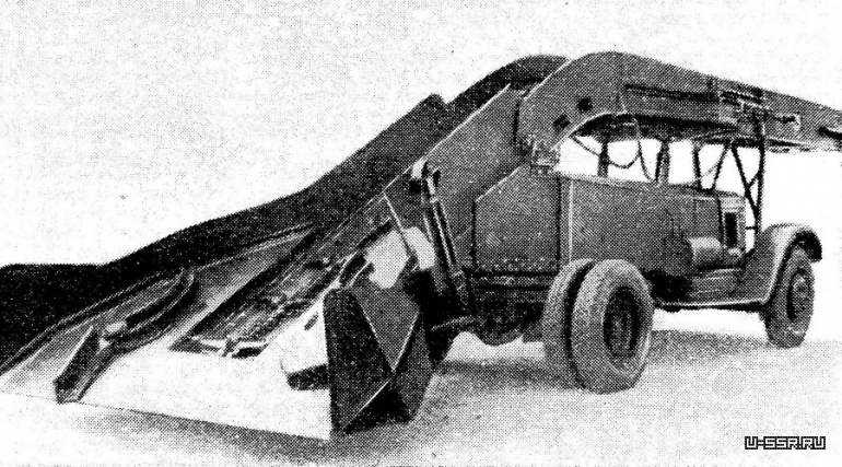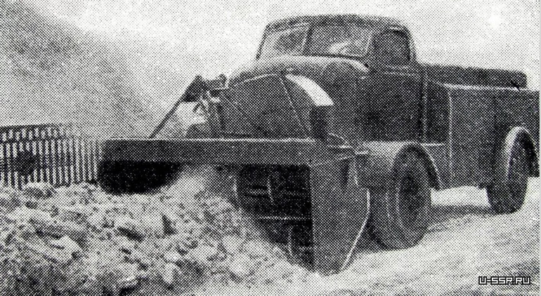 Испытания пробного снегопогрузчика С-1 на базе переделанного грузовика ЗИС-5 военного образца. 1945 год