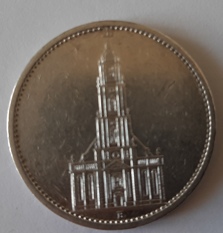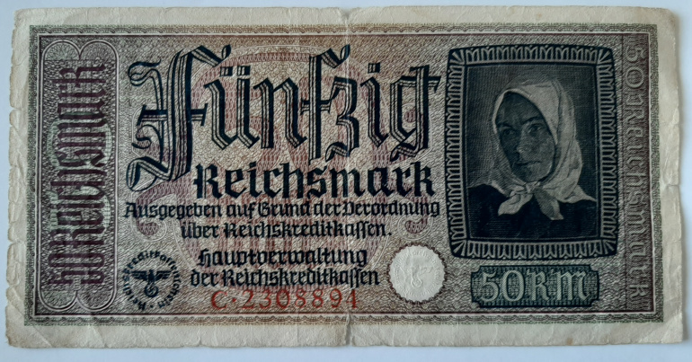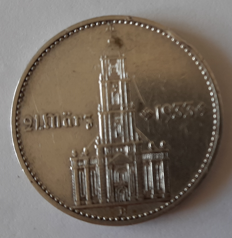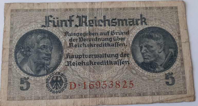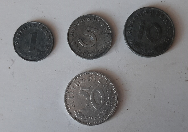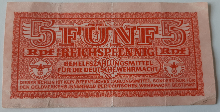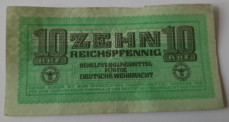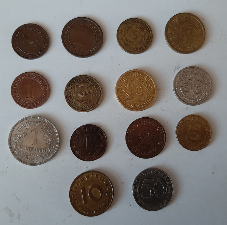 В результате выборов 31 июля 1932 года в Рейхстаг Германии гитлеровцы получили всенародную поддержку. Уже 30 января 1933 года Адольф Гитлер стал рейхсканцлером. Придя к власти нацисты использовали как деньги Веймарской республики, так и выпустили свои денежные знаки. Так в ходу были монеты номиналом от 1 до 50 рентенпфеннигов, и банкноты в рентенмарках, выпускаемые Немецким рентным банком, кроме этого в обращении были монеты от 1 райхспфеннига до 1 райхсмарки, а так же банкноты в райхсмарках, выпущенные Немецким райхс банком. Монеты вначале практически ничем не отличались кроме надписи номинала: на одной стороне обозначалась стоимость монеты, на второй пучки пшеницы. Однако в 1935 году начался выпуск монет с имперским орлом и орлом, держащим в лапах свастику. В 1933 году в нацистской Германии вышла серия памятных монет из серебра номиналом в 2 и 5 райхсмарок, посвященных 450-летию со дня рождения Мартина Лютера – одного из основателей протестантской церкви в Германии. В следующем 1934 году новый выпуск памятных монет – две серии 2 и 5 райхсмарковых монет, посвященных событиям истории: годовщине приведения А.Гитлера к присяге рейхсканцлера 21 марта 1933 года в гарнизонной церкви Потстама, с изображением этой церкви и датой, и вторя серия, посвященная 175-летию немецкого поэта Фридриха Шиллера. Впрочем на этом выпуск памятных монет Германия прекратила. С 1935 года в обращение вышли монеты достоинством в 2 и 5 райхсмарок с изображением Пауля фон Гинденбурга – президента Веймарской республики и гарнизонной церкви в Потсдаме уже без надписи. Выходили эти монеты до начала второй мировой войны, до 1939 года. Так же в обращении были и бумажные банкноты достоинством от 1 до 50 марок. Война потребовала тратить огромные средства, из денежного оборота стали исчезать серебряные и бронзовые монеты, их заменили цинковые и алюминиевые. С оккупацией государств Европы гитлеровцы вводили в обращение как их денежные знаки, так изготовляли и свои. В 1940 году Имперский банк 3 Рейха выпустил в обращение две цинковые монеты достоинством 5 и 10 райхспфеннигов. Монеты были с отверстиями, этим они должны были отличаться от общегерманских. Кроме этого были выпущены банкноты, номиналы которых были в райхспфеннигах или, их еще называли, армейские деньги. Их номиналы были от 5 до 50 райхспфеннигов.