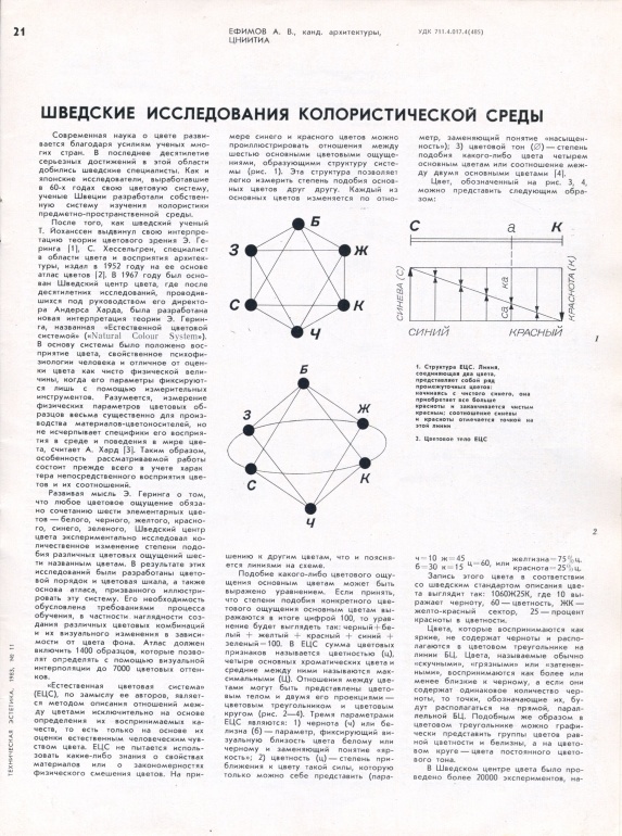 «Естественная цветовая система» (ЕЦС), разработанная в Шведском центре цвета. Использование ЕЦС в исследованиях колористической среды на основе метода картографирования. Исследование изменений цветовых коннотаций в городской среде Стокгольма и Гетеборга. Схема изменения цветовых значений как инструмент формирования колористической среды города.