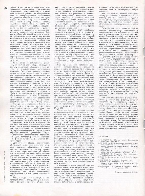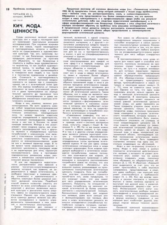 Проводится сопоставление кича и моды с точки зрения понятий вкуса и способности эстетического суждения, определяются некоторые особенности соответствующей им эстетической ценности. Рассматриваются проблема разделения эстетических и внеэстетических моментов в контексте массовой культуры и взаимоотношения в этом аспекте между дизайнером и потребителем.