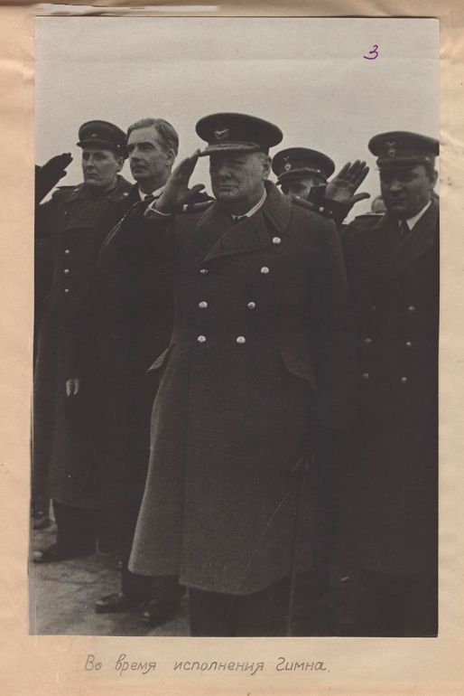 Молотов, Черчилль и Рузвельт во время исполнения советского, американского и английского гимнов. / Molotov, Churchill, and Roosevelt during the performance of the Soviet, American, and English hymns.
