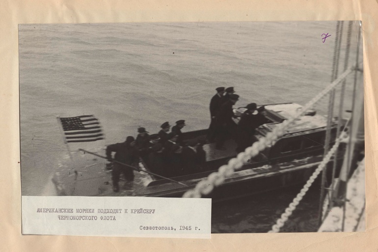 Американские моряки подходят к крейсеру Черноморского флота, Севастополь, 1945 г. / American sailors approach the black sea fleet cruiser, Sevastopol, 1945.