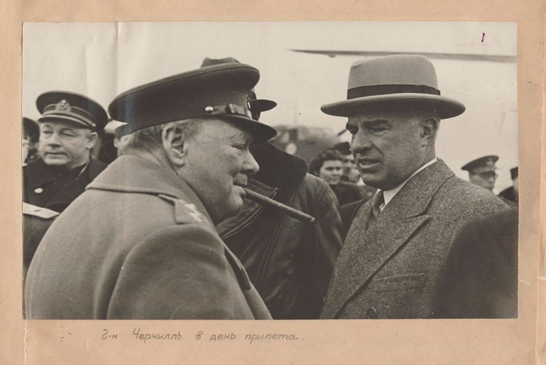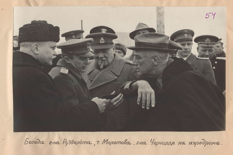Беседа господина Рузвельта, товарища Молотова и господина Черчилля на аэродроме / Conversation between Mr. Roosevelt, comrade Molotov and Mr. Churchill at the airport