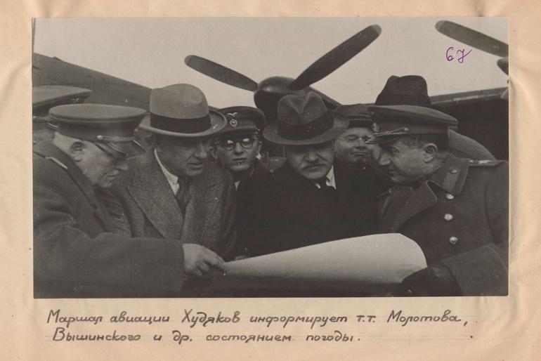 Маршал авиации Худяков информирует товарищей Молотова, Вышинского и других о состоянии погоды / Marshal of aviation Khudyakov informs the comrades Molotov, Vyshinsky, and others, about the state of the weather