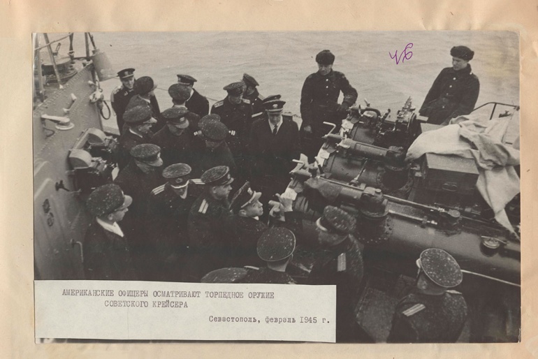 Американские офицеры осматривают торпедное оружие советского крейсера. Севастополь, февраль 1945 / American officers inspect the torpedo weapons of the Soviet cruiser. Sevastopol, February 1945