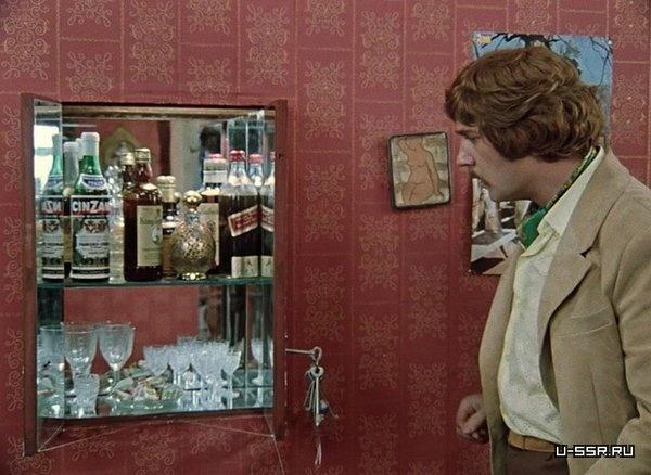 А что мы видим в баре? По нынешнем временам ничего особенного. Ассортимент какой-нибудь «Пятерочки»: Вермут Чинзано и три бутылки недорогого виски: Джонни Уокер Ред Лейбл, Баллантайнс и Король Георг IV (сейчас такое уже не производят). По тем временам импортный алкоголь мог позволить себе только тот у кого имелась советская официальная внутренняя валюта – чеки Внешпосылторга, т.к. его продавали только в магазинах «Березка». А покупать на чеки алкоголь в «Березке» будет только человек, который уже удовлетворил все свои базовые потребности, и теперь, как говорится, бесится с жиру.