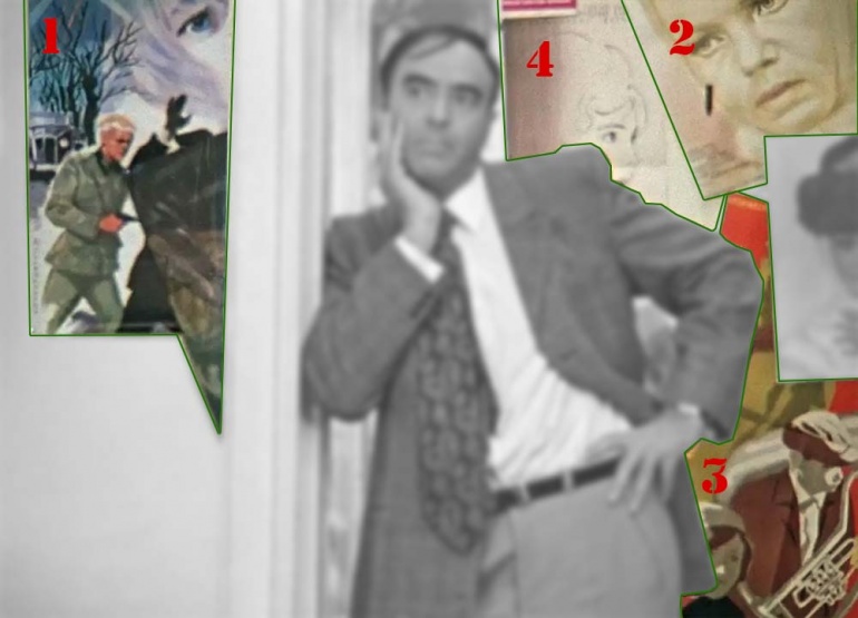 «Э! – сказали мы с Петром Ивановичем, – а что это за плакаты висят на стене в квартире у Александра Сергеевича Тимофеева?» В самом деле – почему до сих пор не пытался выяснить, что там налепили художники-оформители? Ведь не может быть, чтобы это была какая-то совершенно несущественная деталь. Плакаты – это, явно, киноплакаты. Но каких фильмов? Гипотетически, поскольку жена Шурика, Зиночка, киноактриса, то наверное это плакаты фильмов, в которых, теоретически, она играла. Ведь все стены завешаны её фотографиями. Значит и фильмы – тоже с её участием. Так что это за фильмы?