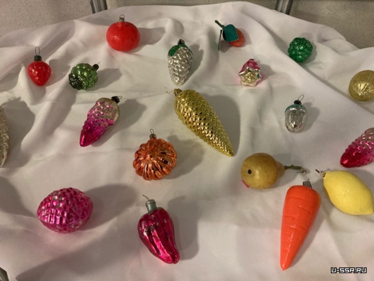Ёлочные игрушки мы разбили по темам: растения и плоды, дом и человек, животные, сосульки. Самые необычные экспонаты — это игрушки в форме самовара и чайника. Стеклянные часы, рыбки, космонавт, юла, колдун, морковка, лимон — вот далеко не весь перечень игрушек.