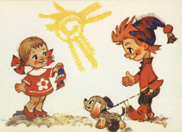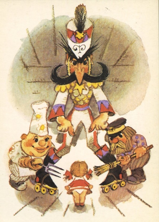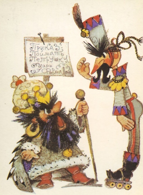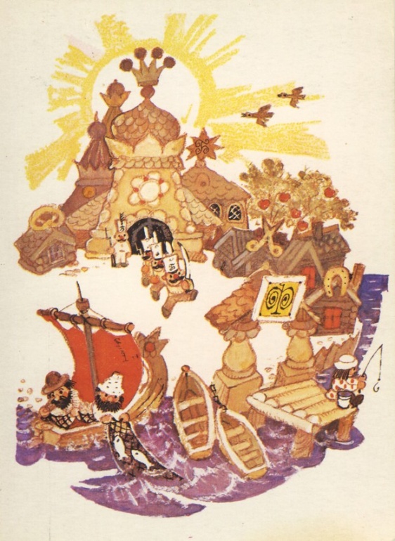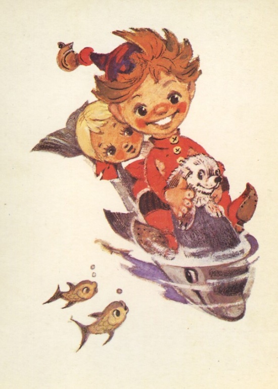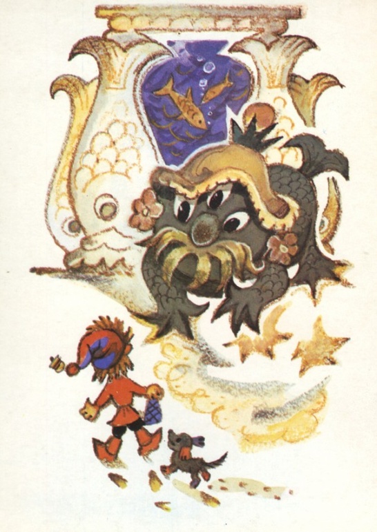 Имя героя, сюжетный ход «Приключений Петрушки» восходят к русскому фольклору, к ярмарочному кукольному театру. И эта основа оказалась как нельзя более органичной для художника. Начиная с обложки, на которой балаганная кукла Петрушка приглашает зрителей принять участие в веселом спектакле-игре, и кончая апофеозом сказки, на последнем рисунке серии с летящим по волнам умным и добрым дельфином, увозящим к свободе героев: девочку-мастерицу Аленку, верного Тузика и поборовшего все превратности Петрушку,— все здесь построено по законам народного искусства, которое во все времена было близко и понятно детям.
