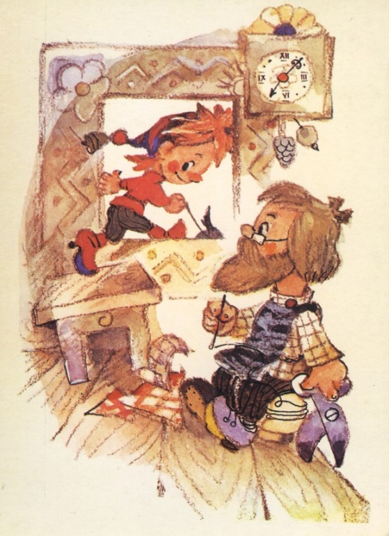 Там жил удивительный мастер Трофим, который умел шить кукол. Трофим хотел, чтобы у него был помощник — сын Петрушка. Он достал материал и принялся за работу. Но не успел положить последний стежок, как Петрушка вырвался из его рук, подбежал к зеркалу и показал себе длинный-предлинный нос.