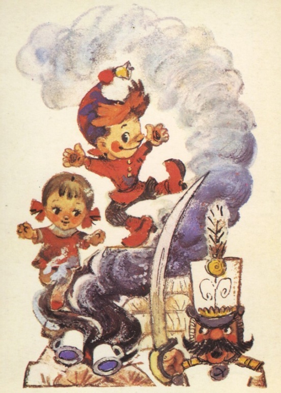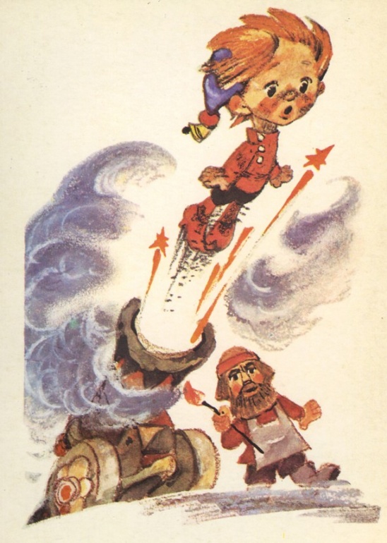 — Помоги мне,— сказал Петрушка.— Выстрели из пушки, а я буду вместо ядра. Так я попаду в башню и выручу Аленку.