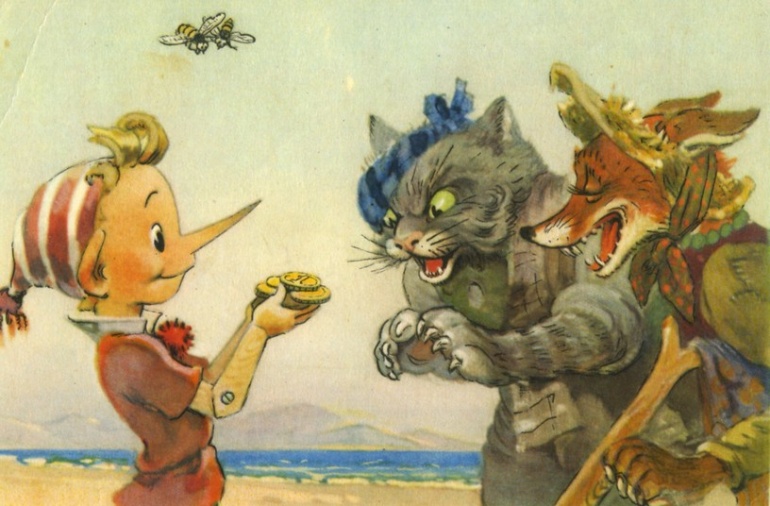 Буратино взял пять червонцев и побежал домой. Но по дороге ему попались двое нищих — лиса Алиса и кот Базилио.