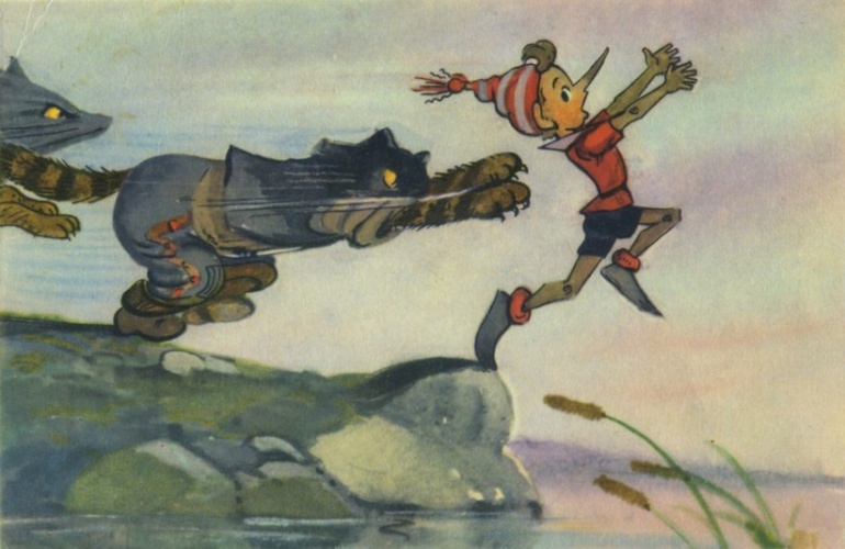 По дороге кот и лиса потихоньку переоделись разбойниками и напали на Буратино. Он сунул червонцы в рот и пустился бежать. Кот и лиса нагнали Буратино. Ему оставалось только броситься в воду.