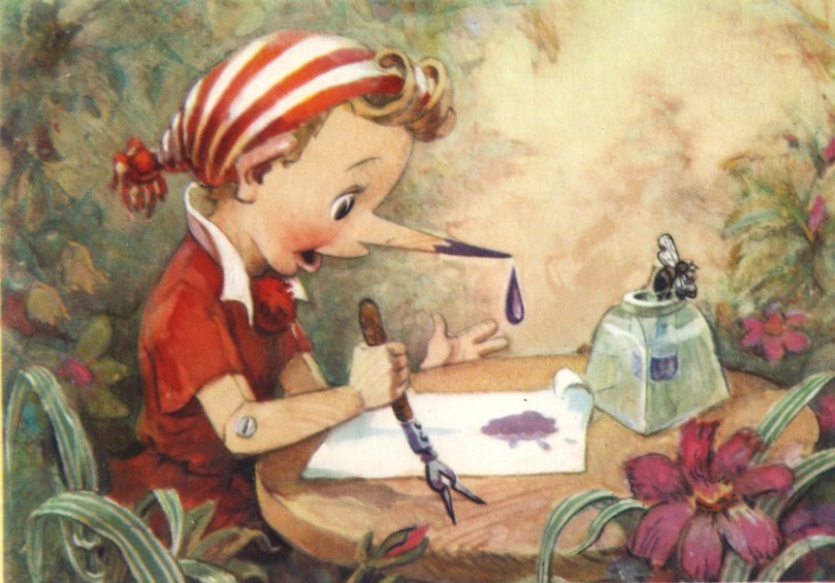 Буратино увидел в чернильнице муху, сунул туда нос .и посадил на бумагу кляксу.