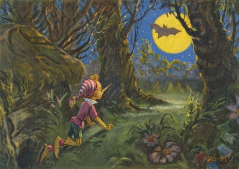 Буратино крысиным ходом вылез из чулана. Летучая мышь повела его через лес.