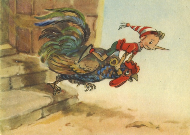 ...горшок на столе зашатался, покатился, разбился, из него выскочил Буратино и кинулся в дверь. На дворе он схватил большого петуха, сел на него верхом, и они помчались, как ветер. Карабас и Дуремар пришли в себя и кинулись в погоню, но Буратино уже и след простыл.