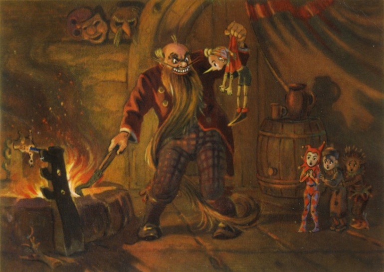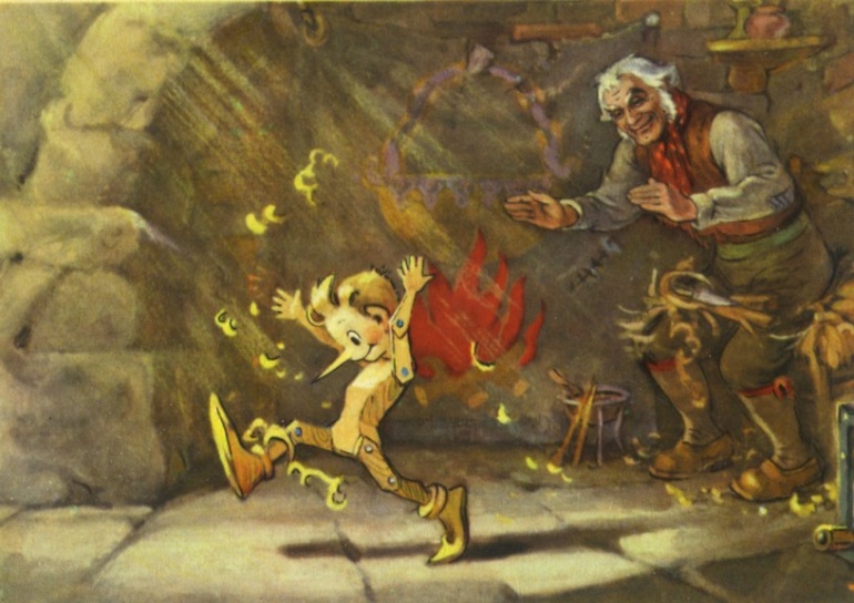 Карабас Барабас жарил цыпленка себе на ужин. Он сказал: «В очаге мало дров, брошу в огонь Буратино».