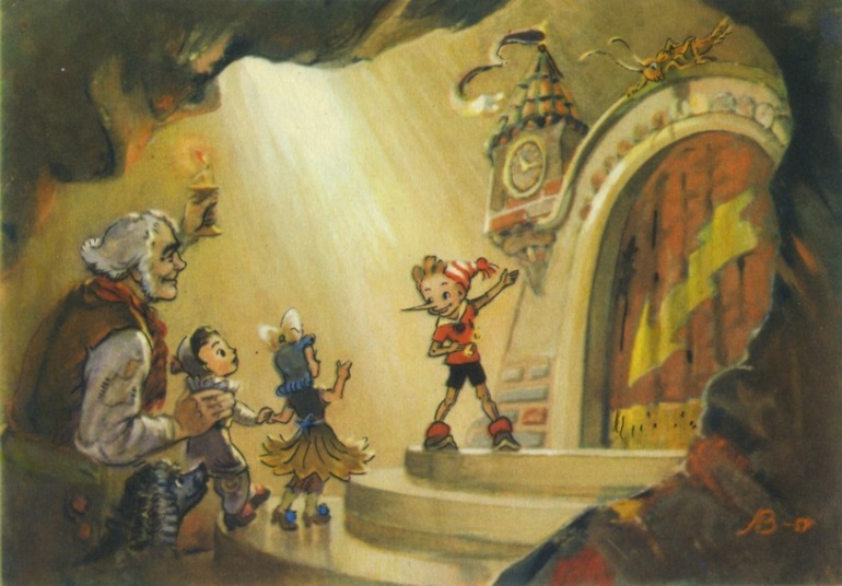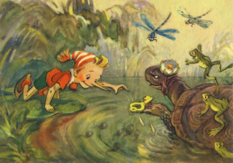 «Я дарю тебе этот золотой ключик. Его обронил в пруд Карабас Барабас. Этим ключиком открывается волшебная дверца»,— сказала черепаха Тортила.