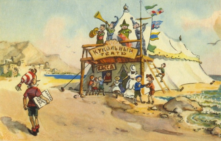 Буратино взял азбуку и пошел в школу. По дороге он увидел кукольный театр Карабаса Барабаса. Ему ужасно захотелось посмотреть кукольное представление.
