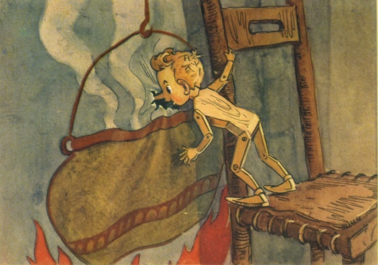 Буратино увидел очаг и котелок над огнем. Он не знал, что это нарисованное, и сунул туда нос, но только проткнул в холсте дырку. Буратино посмотрел в дырку и увидел за холстом какую-то дверцу.
