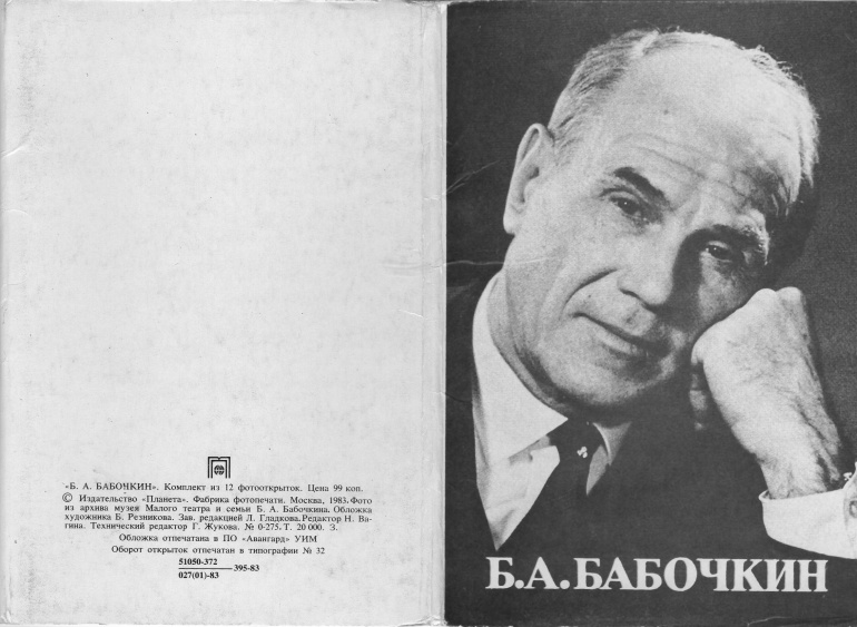 Комплект из 12 фотооткрыток. "Б. А. Бабочкин". Цена 99 коп. Издательство "Планета", Москва, 1983 год. ото из архива музея Малого театра и семьи Б. А. Бабочкина.