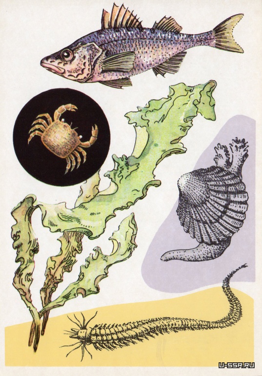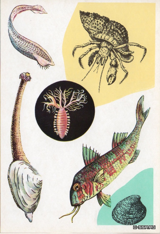 На открытке: ланцетник (длина около 6 см), диоген (длина до 30 мм), барабулька, венус, тапес. В круге— полихета фабриция (длина до 3 мм).