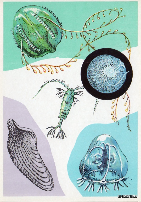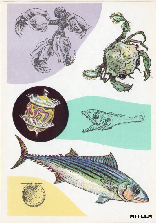 На открытке: морские уточки из рода лепас, молодой краб портунус, личинка пеламиды, пеламида, икринка кефали. В круге — личинка червя протодрилуса (размер около 70 мк).