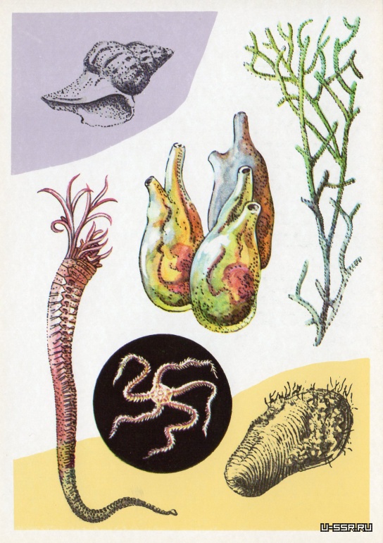 На открытке: кладофора, асцидии ционы, ракушка модиола, меллина, улитка трофонопсис. В круге — амфиура (диаметр диска 6 мм).