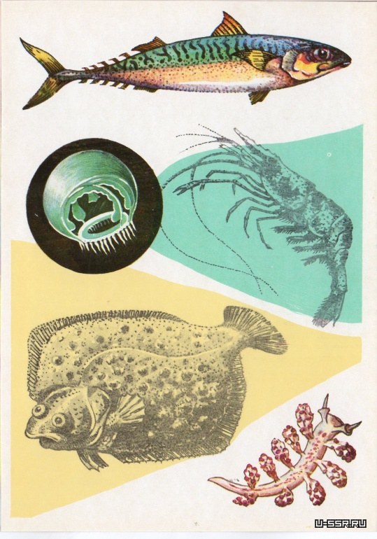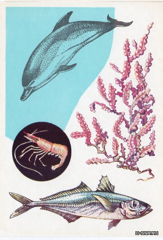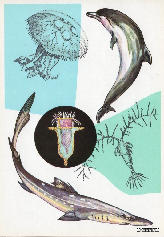 На открытке: афалина (длина до 3 м), рачок акарция (0,2 мм), катран (длина до 2 м), аурелия. В круге — морской колокольчик (при сильном увеличении).