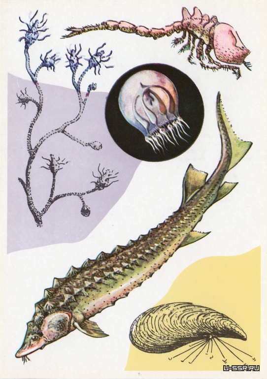 На открытке: кумовой, рачок, дрейссена, осетр, кордило-фора (высота до 10 см). В круге — Палласова мёризия (диаметр зонтика 3 мм).
