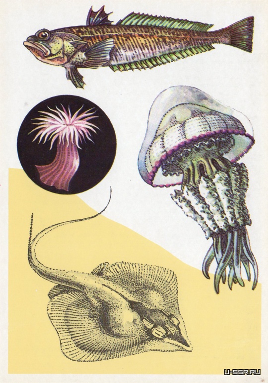 На открытке: морской дракончик, корнерот, скат хвостокол. В круге — актиния цилиста (высота около 4 см).