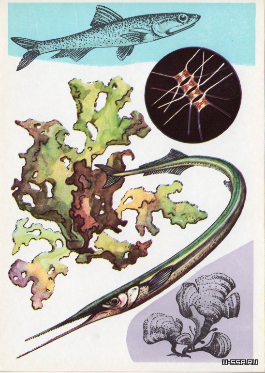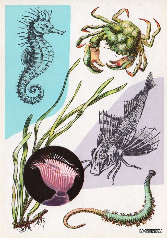 На открытке: морской конек, травяной краб, морской петух, пескожил, зостера. В круге — мшанка (при сильном увеличении).