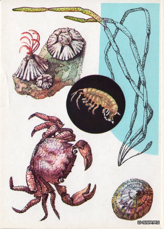 На открытке: морские желуди (высота около 10 мм), сцитосифон, пателла (длина 35—40 мм), мраморный краб. В круге — гаммарус (около 10 мм).