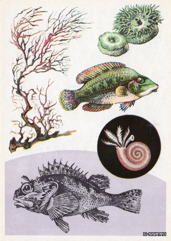На открытке: актинии (диаметр 2—3 см), зеленушка, скорпена, цистозира. В круге — спирорбис (длина 5 мм).