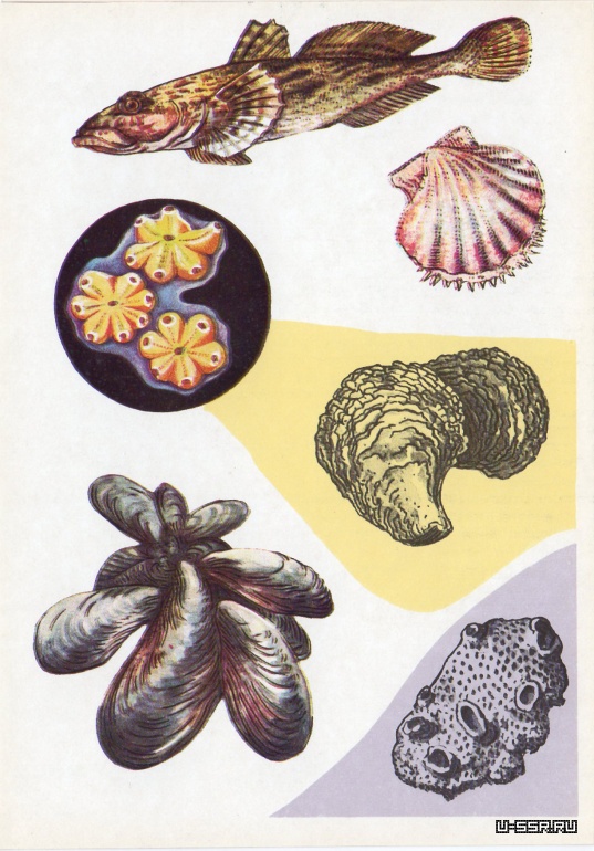 На открытке: бычок-кнут, гребешок, две устрицы, колония губок, группа мидий. В круге — колониальные асцидии ботриллус (размер особи 1,5—3 мм).
