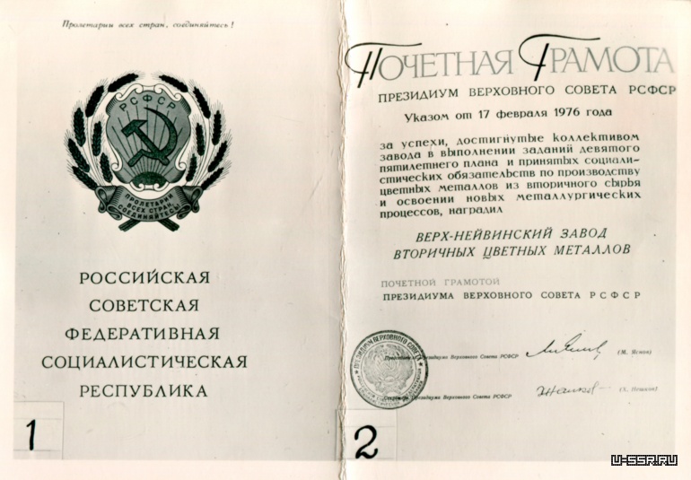 Почетная грамота Президиума Верховного Совета РСФСР.