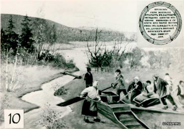 Промывка золотосодержащего песка в 1819 г. и медаль о находке золотого самородка в песке. 1813 г.