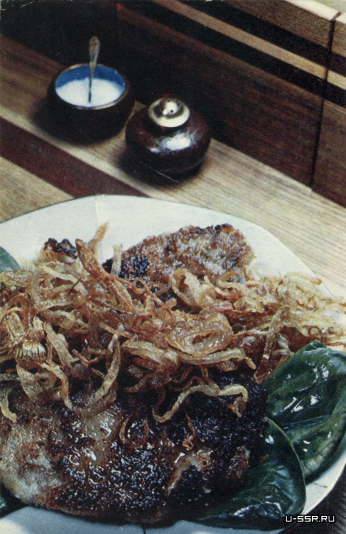 Мясо нарезать кусками поперек волокон, выбить его тупой стороной большого ножа, посыпать перцем и солью. На сковородке слегка подрумянить сливочное масло, положить в него куски мяса и поджаривать их, все время поливая кипящим маслом. Когда мясо еще немного сыровато внутри, положить куски на блюдо и полить соусом.