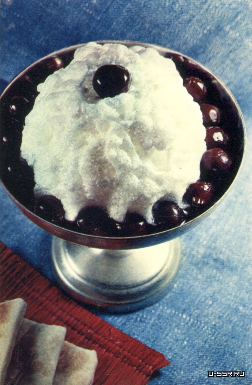 Клюкву перебрать, вымыть, облить кипятком, размять и выжать из нее сок. Выжимки залить I1/] стаканами горячей воды, поставить на плиту, довести до появления пара, отбросить на сито, процедить несколько раз. Полученный отвар вскипятить, засыпать в него манную крупу и варить 20— 25 минут. Затем снять с плиты, добавить сахар. Посуду с полученной массой поставить на лед или снег и взбивать, пока масса не станет пенистобелой и густой.