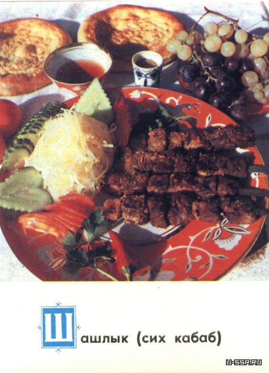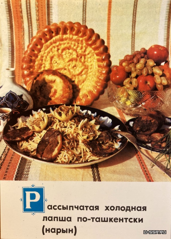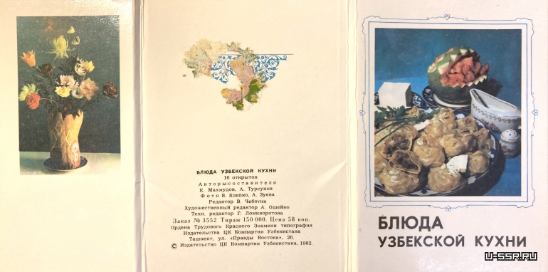В предлагаемом комплекте открыток представлено 16 блюд, которые являются самыми характерными для узбекской кухни и подчеркивают ее специфическую особенность и национальный колорит.