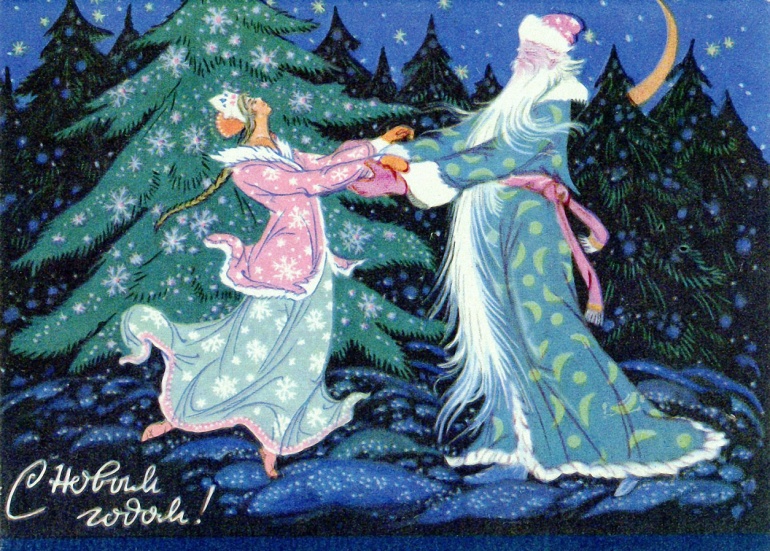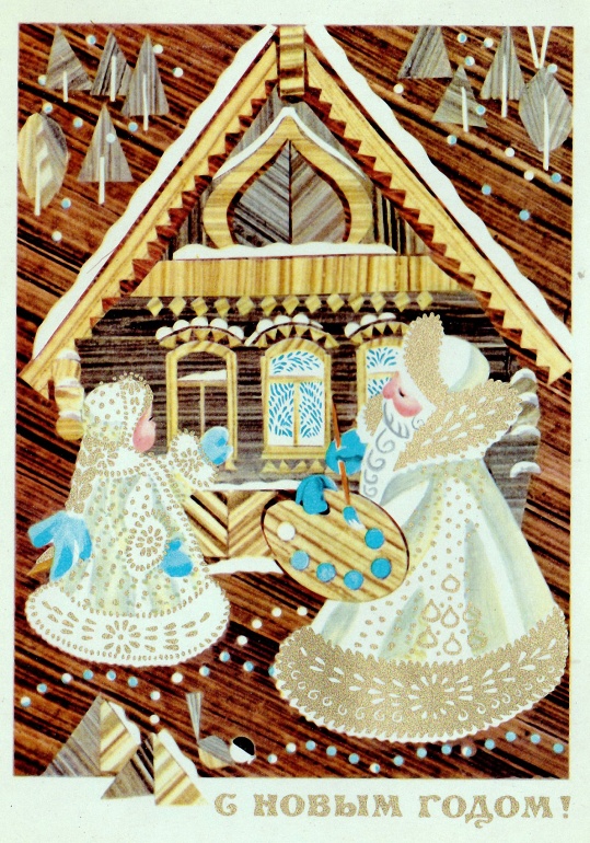 Снегурочка и Дед Мороз расписывают изморозью окна