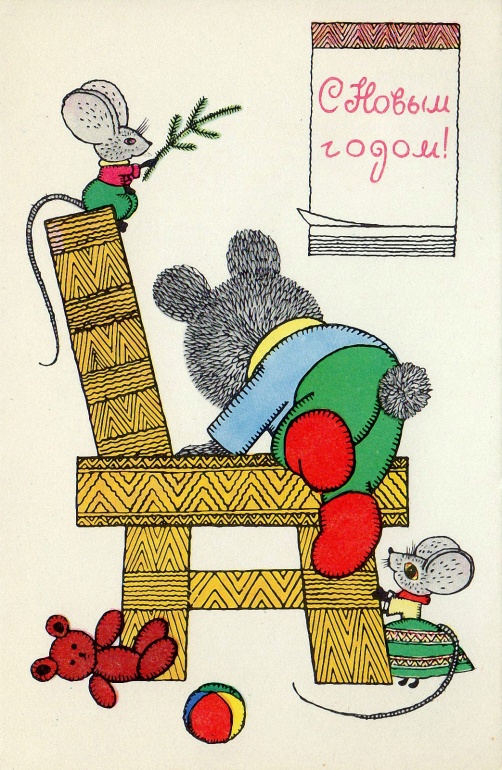 Медвежонок лезет переворачивать календарь. Не на 3-е сентября, а на Новый год! Помогают ему мышки.