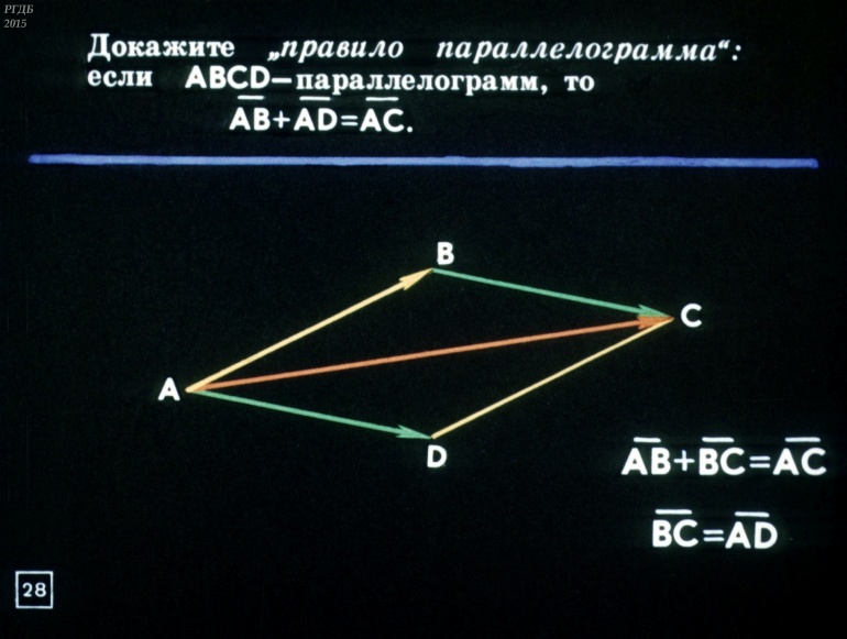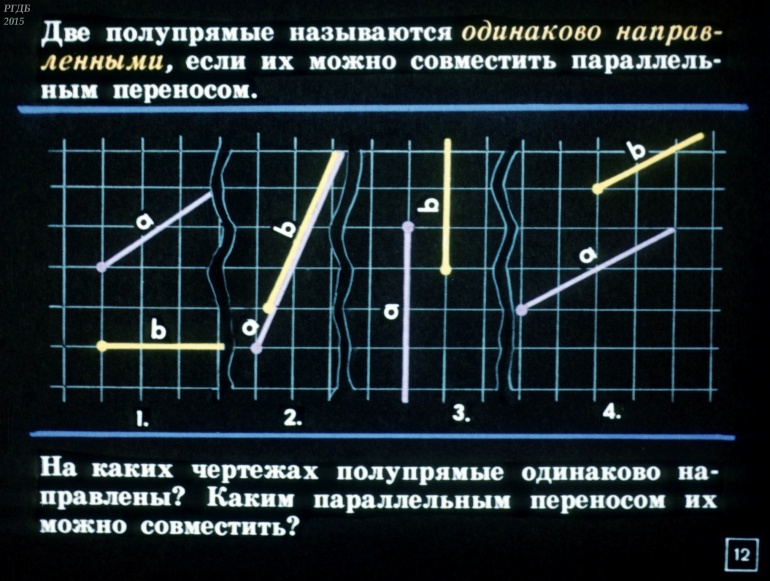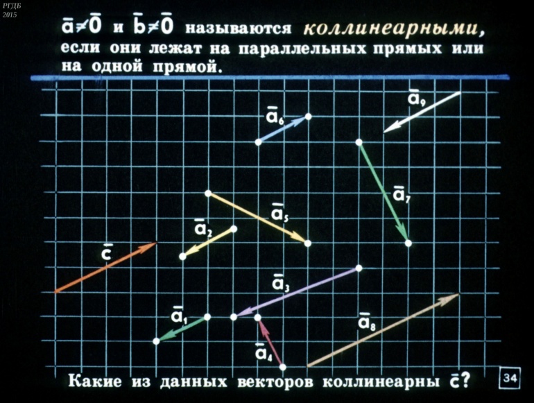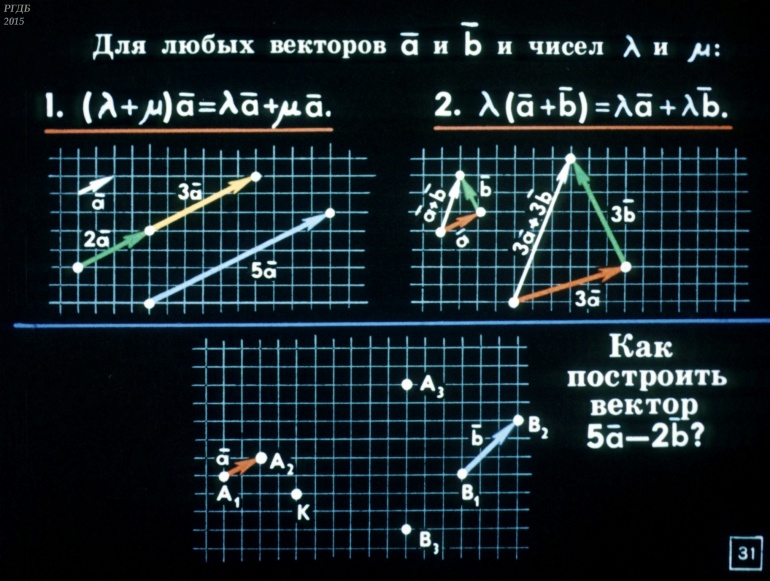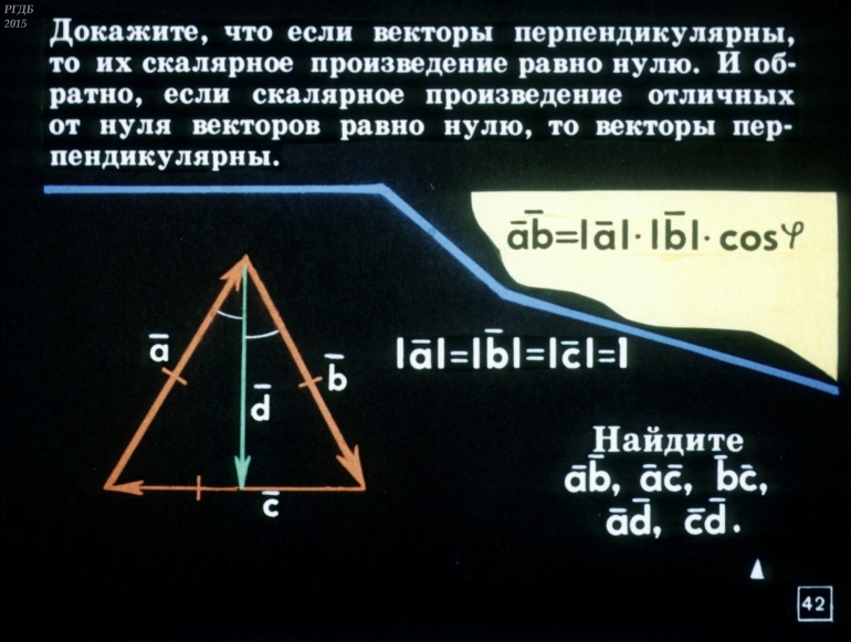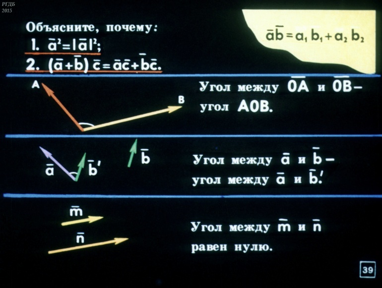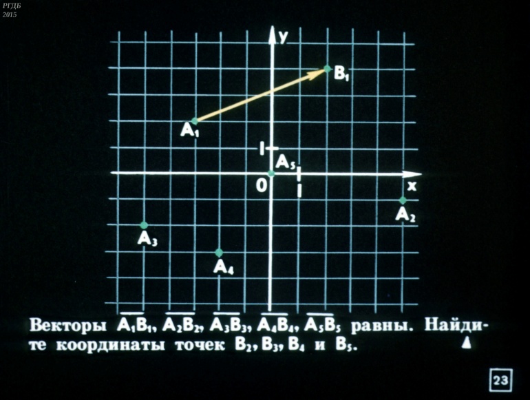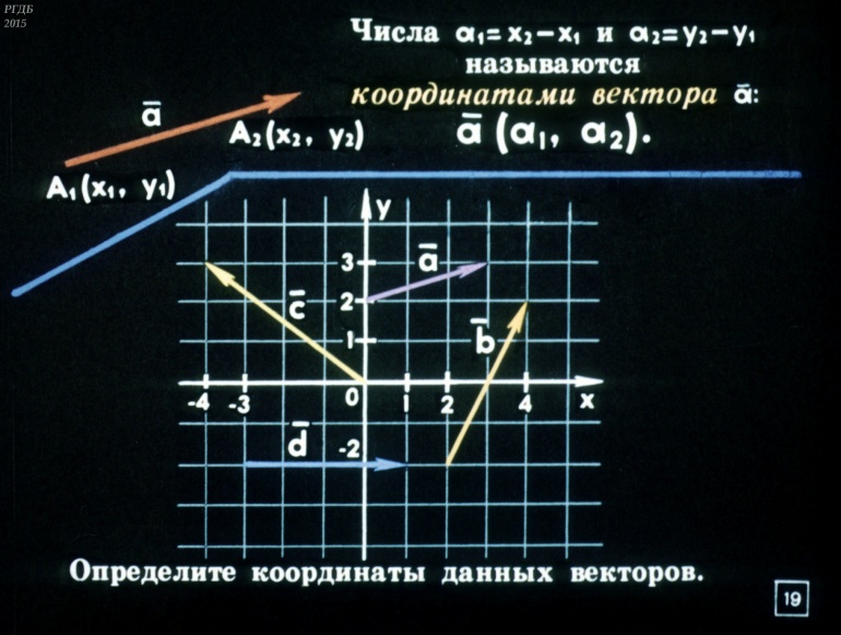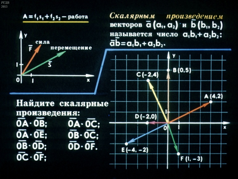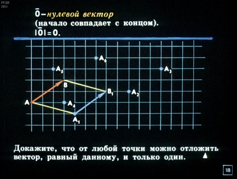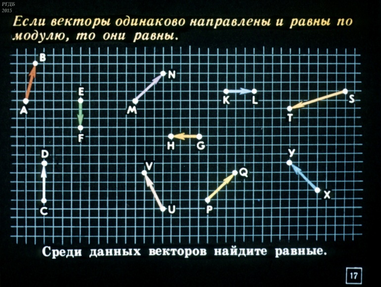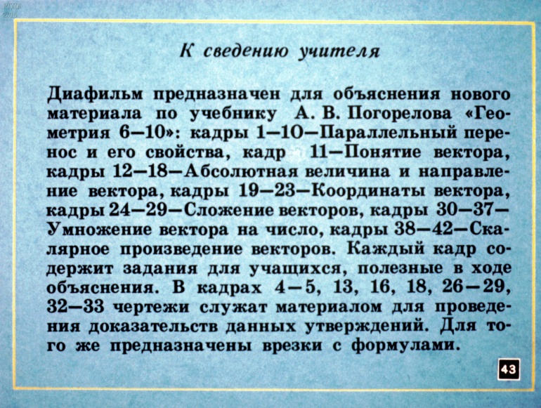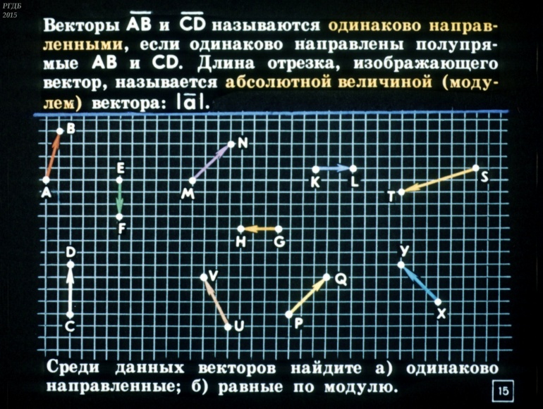 Векторы 0 Категория: ДиафильмыПросмотры: 818 Диафильм "Векторы". Геометрия для 8-го классаСтудия "Диафильм" Госкино СССР, 1984 год. Д-247-84