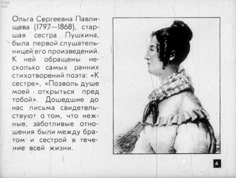 Ольга Сергеевна Павлищева (1797-1868), старшая сестра Пушкина, была первой слушательницей его произведений. К ней обращены несколько самых ранних стихотворений поэта: "К сестре", "Позволь душе моей открыться пред тобой". Дошедшие до нас письма свидетельствуют о том, что нежные, заботливые отношения были между братом и сестрой в течение всей жизни.