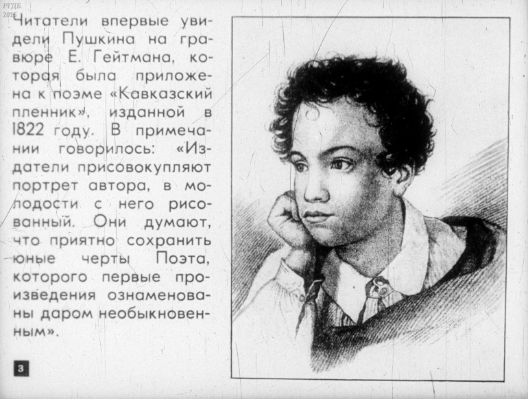 Читатели впервые увидели Пушкина на гравюре Е. Гейтмана, которая была приложена к поэме «Кавказский пленник», изданной в 1822 году. В примечании говорилось: «Издатели присовокупляют портрет автора, в молодости с него рисованный. Они думают, что приятно сохранить юные черты Поэта, которого первые произведения ознаменованы даром необыкновенным».